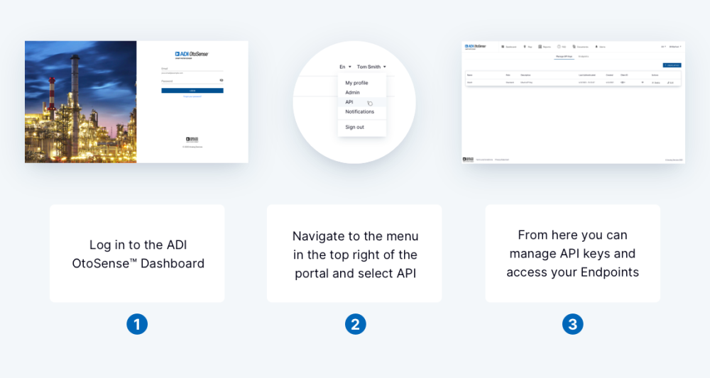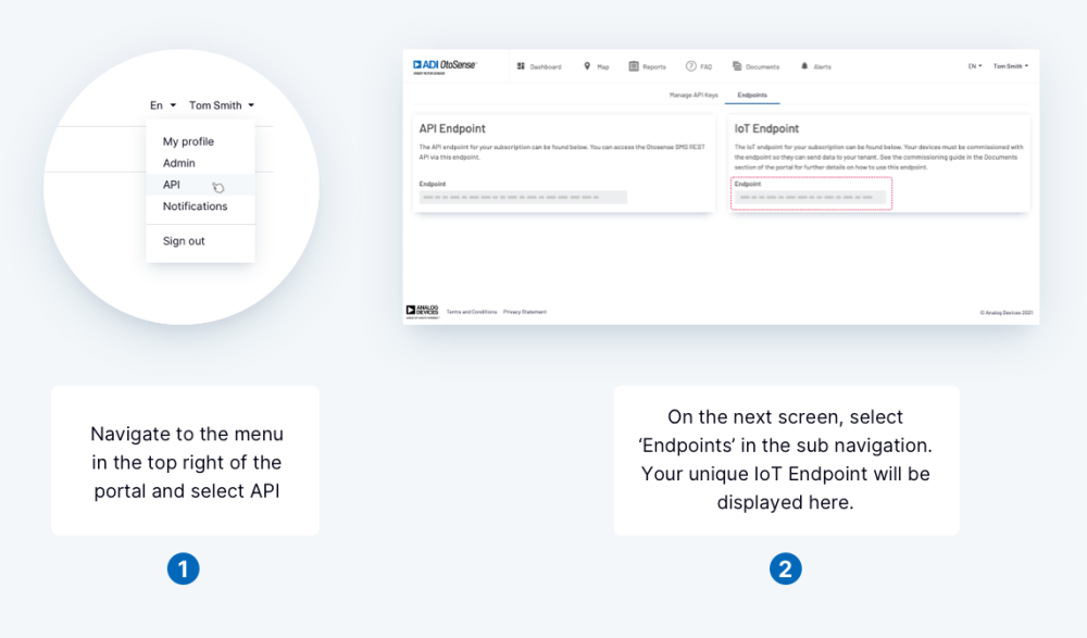Figure 1: Generating API Keys and locating the API and IoT Endpoints in the ADI OtoSense™ SMS Developer Portal
