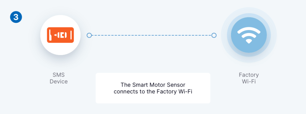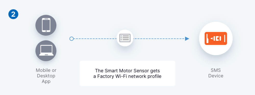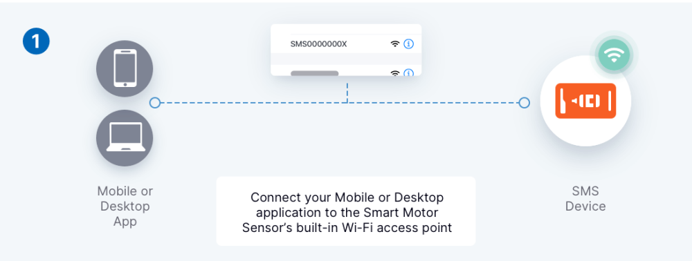 In order to commission a Smart Motor Sensor (SMS), a mobile or desktop application will first need to connect to the wireless access point (AP) broadcast by the SMS. After the connection has been established, mobile and desktop applications can interface with the Smart Motor Sensor Server API via REST calls.