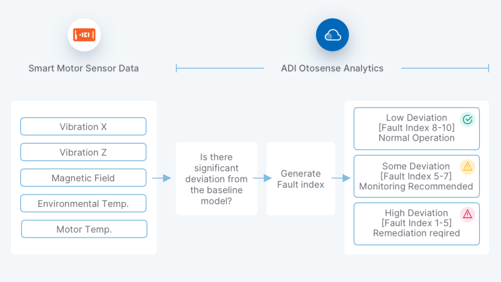 During an initial learning period, the Smart Motor Sensor works alongside the ADI OtoSense™ Cloud to create a uniquely tailored baseline model of a motor’s operation.